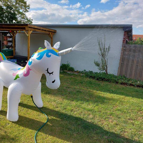 Wir verkaufen das nur einmal getestete Wasserspielzeug. Wie auf dem foto zu sehen, kommt aus dem Horn Wasser ausgesprenkelt. Es wird mit Luft gefüllt und an einem Gartenshlauch angesteckt.